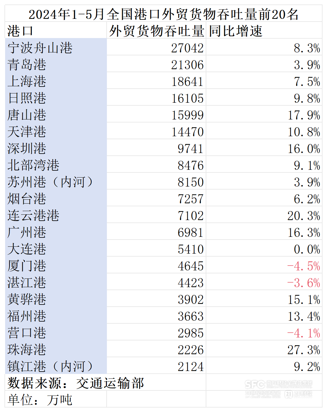 21世纪经济报道记者梳理发现,前5个月,我国港口集装箱吞吐量前10名分别为上海港、宁波舟山港、深圳港、青岛港(601298)、广州港、天津港、厦门港、苏州港(内河)、北部湾港(000582)、日照港(600017)。同期,我国港口外贸货物吞吐量前10名为宁波舟山港、青岛港、上海港、日照港、唐山港(601000)、天津港、深圳港、北部湾港、苏州港(内河)、烟台港。