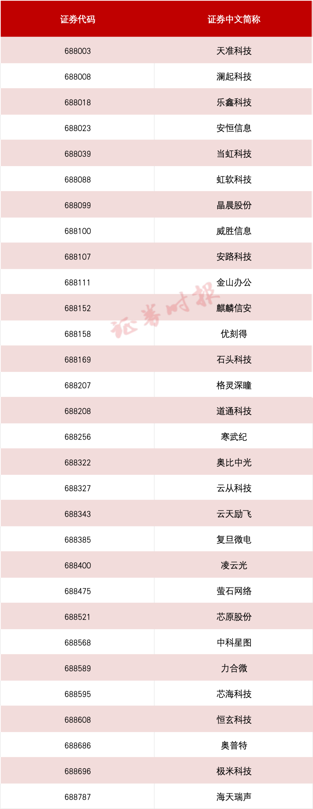 根据以上筛选条件和筛选方法,中证指数有限公司选取天准科技、澜起科技、乐鑫科技、安恒信息、当虹科技、虹软科技等30只科创板股票作为该指数的首批成份股。