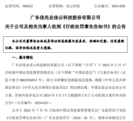 回顾来看,佳云科技因涉嫌信息披露违法违规,2024年5月17日收到中国证监会下发的《立案告知书》,2024年7月31日收到广东证监局下发的《行政处罚事先告知书》。
