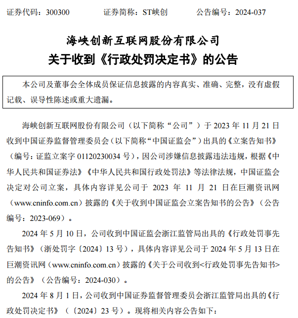 回顾来看,ST峡创因涉嫌信息披露违法违规,2023年11月21日收到中国证监会出具的《立案告知书》,2024年8月1日收到浙江证监局出具的《行政处罚决定书》。