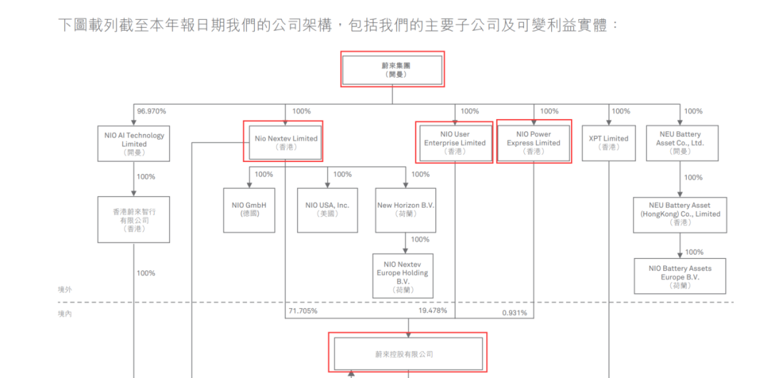 蔚来2023年年报显示,蔚来集团为一家控股公司,本身没有实质性业务,主要依靠其中国子公司蔚来中国开展业务,蔚来集团共计拥有蔚来中国92.114%的股权。