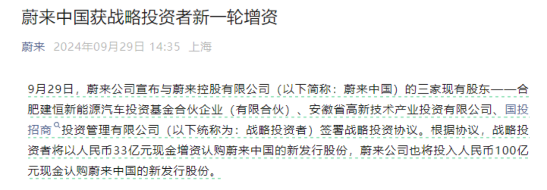9月29日,蔚来公司宣布,与蔚来控股有限公司(以下简称:蔚来中国)的三家现有股东——合肥建恒新能源汽车投资基金合伙企业(有限合伙)、安徽省高新技术产业投资有限公司、国投招商投资管理有限公司(以下统称为:战略投资者)签署战略投资协议。根据协议,战略投资者将以人民币33亿元现金增资认购蔚来中国的新发行股份,蔚来公司也将投入人民币100亿元现金认购蔚来中国的新发行股份。