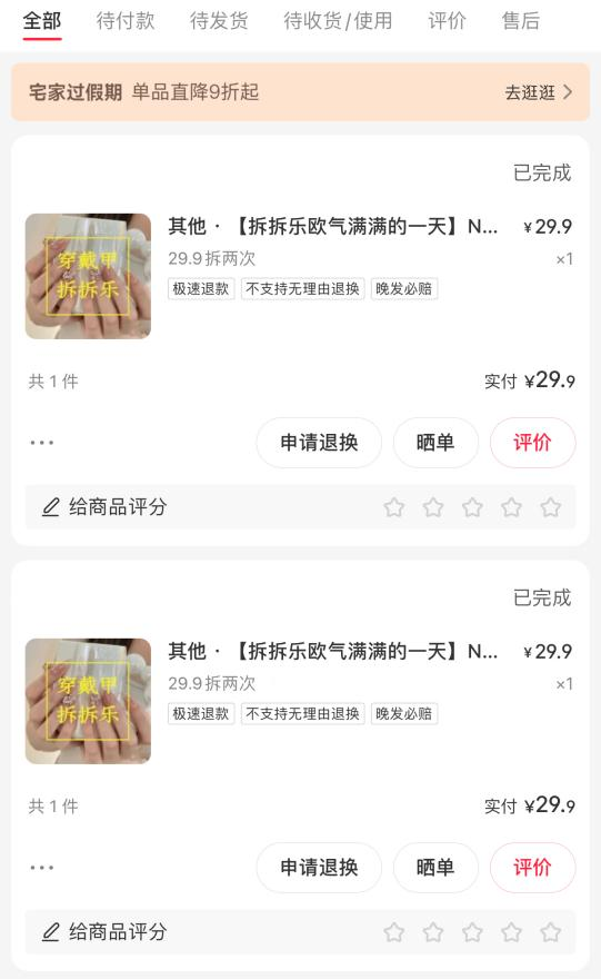 出于好奇,记者花费29.9元购买了两次拆盲盒的机会,等待40多分钟后才轮到记者的订单开拆。两个盲盒的卡片颜色并不相同,于是记者又花了29.9元想再拆两次。再次等待30多分钟后主播开拆记者订单,这回记者“中奖”两次,以29.9元的价格带回了四盒穿戴甲。