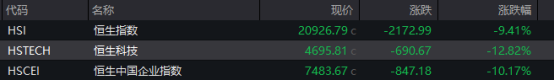 今日,港股两大股指低开低走,盘中均跌超10%。截至收盘,恒生指数跌9.41%报20926.79点,创2008年10月底以来,即近16年来单日最大跌幅。恒生科技指数跌12.82%报4695.81点,恒生中国企业指数跌10.17%报7483.67点,创该指数上市以来单日最大跌幅,刷新历史。成交额方面,今日港股主板成交额达6204.38亿港元,创出历史新高。