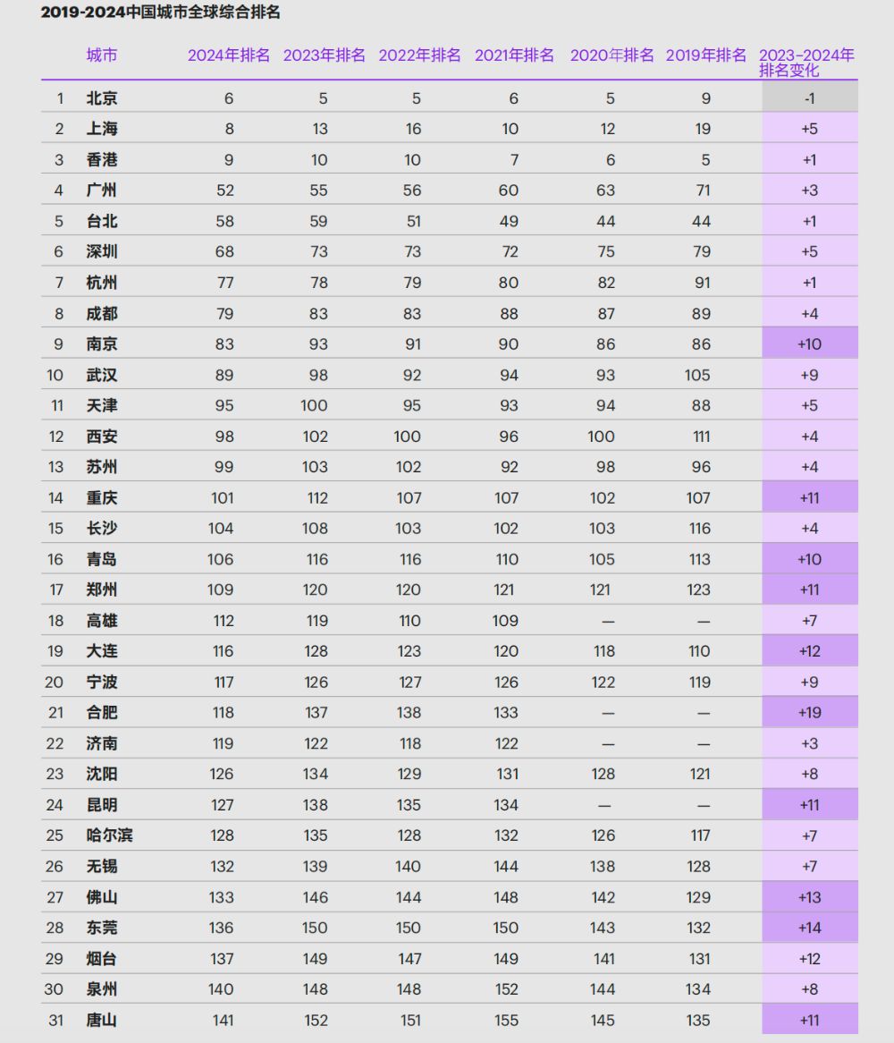 (2019—2024中国城市全球综合排名,来源:《2024年全球城市指数报告》)