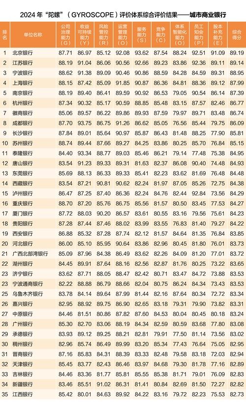 中银协发布2024年“陀螺”评价结果:工建招中农综合得分超90