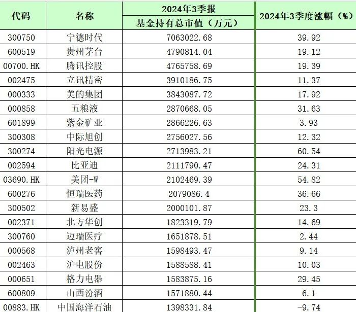 天相投顾数据显示,公募基金全部持仓中(含港股),宁德时代、贵州茅台、腾讯控股、立讯精密、美的集团、五粮液、紫金矿业、中际旭创、阳光电源、比亚迪成为公募基金前十大重仓股(统计范围为已公布2024年三季报的5142只积极投资偏股型基金)。