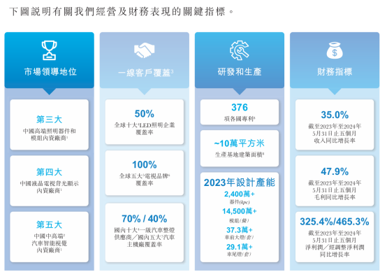 在中国高端照明行业的国内器件和模块制造商中排名第三,在同行业所有器件和模块制造商中排名第5,2023年市场份额为5.3%。