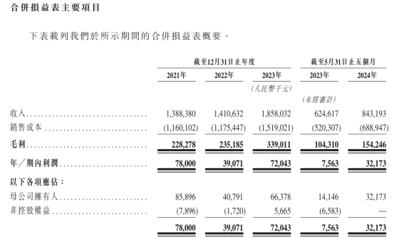 同时,晶科电子营收和利润也在持续增长。招股书显示,晶科电子2021年、2022年、2023年营收分别为13.88亿、14.11亿、18.58亿元;毛利分别为2.28亿、2.35亿、3.39亿元;期内利润分别为7800万、3907万、7204万元。2024年前5个月营收为8.43亿元,上年同期的营收为6.25亿元;毛利为1.54亿元,上年同期毛利为1.04亿元;期内利润为3217万元,上年同期的期内利润为756万元。