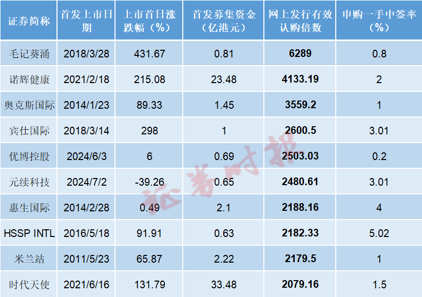 从上图不难发现,这些港股史上的“超购王”绝大部分表现均还不错,除了今年上市的优博控股、元续科技和2014年上市的惠生国际表现不佳外,其他7只个股的上市首日均出现了较大涨幅,尤其是毛记葵涌首日涨幅达到431.67%。