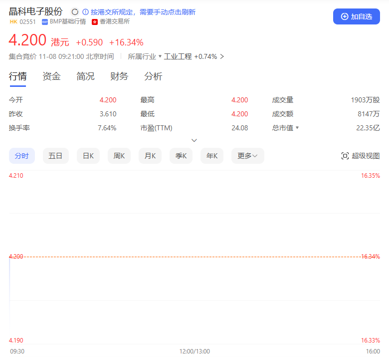 11月8日,晶科电子正式登陆港股,开盘上涨16.34%。