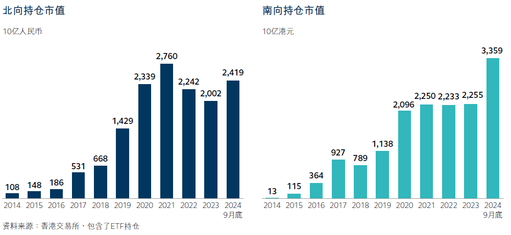 伴随着沪深港通的稳步发展,越来越多的内地投资者通过港股通开展跨境投资配置。截至2024年9月,内地投资者通过港股通持有的证券资产总市值超过3.3万亿港元,是2014年底的200多倍。