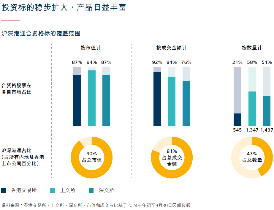 截至2024年9月底,沪深港通下合资格股票超过3,300只,已覆盖沪深港三地市场上市公司总市值的九成,成交规模的八成以上。随着港股不同投票权架构公司、生物科技公司和外国公司以及上交所科创板公司等先后纳入,沪深港通合资格股票更加多元化,为境内外投资者更加灵活配置资产、享受两地市场红利提供了便利。