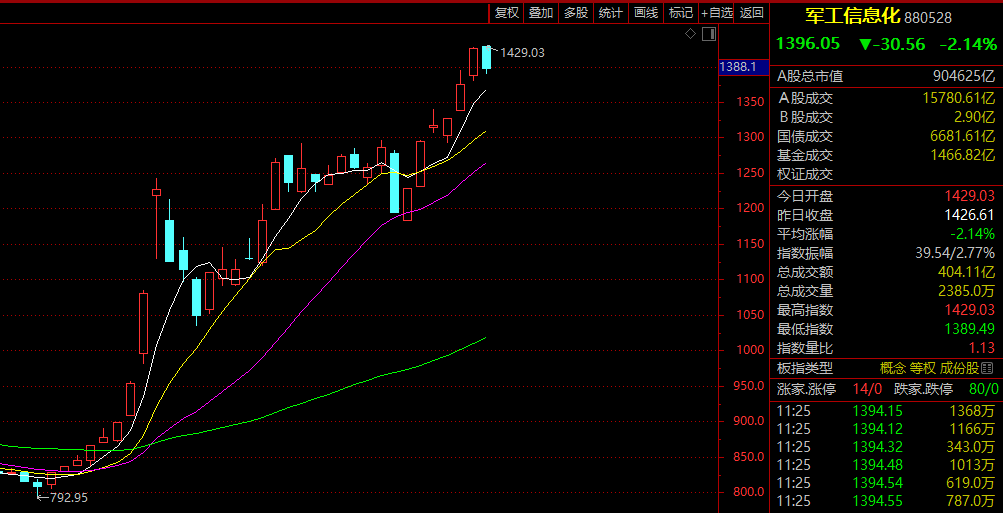 而在资本市场,自歼-35A横空出世的那一刻,全市场的热情就已经被点燃。上周,申万国防军工指数暴涨12.23%,行业整体涨幅排名在申万全部31个行业中排名第二。周成交量达到4567.73亿元,环比增长29.17%,再次创下历史新高。不过,今日盘中,军工板块进入回调,截至午间收盘跌超2%。