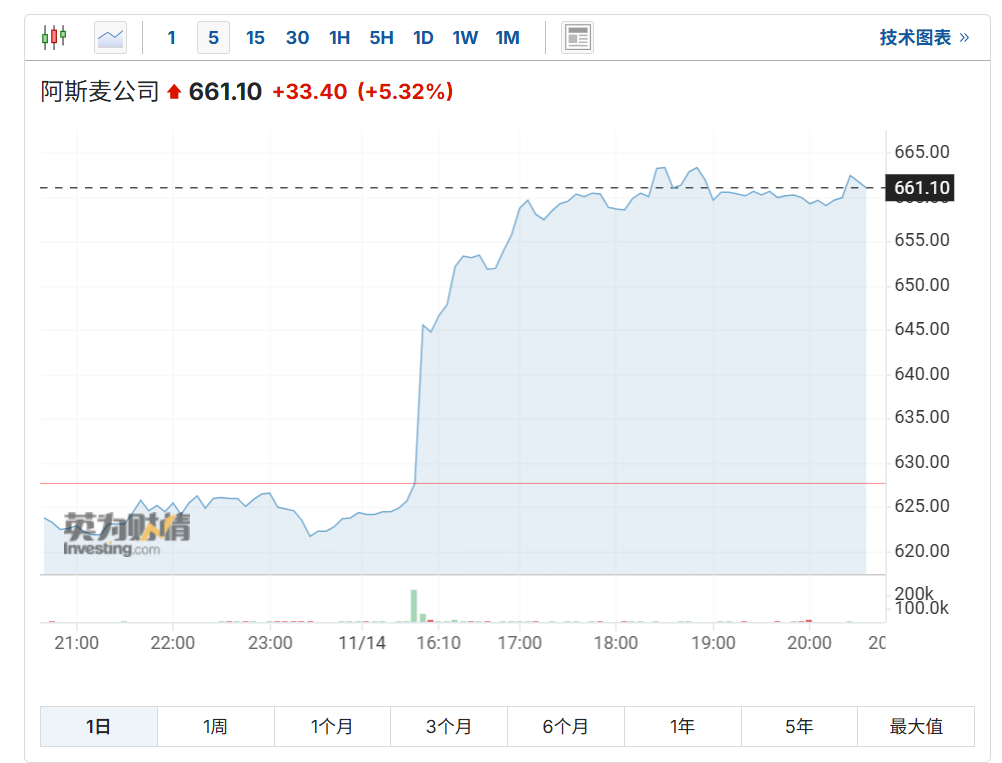 11月14日,光刻机巨头阿斯麦(ASML)的股价在欧洲市场大幅拉升,截至发稿,该公司涨超5.3%,报661.5欧元/股。另外,美股盘前,阿斯麦股价涨幅超过3%。