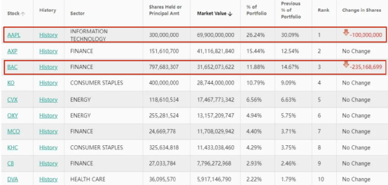 美国运通位列第二,持仓数量约为1.52亿股,持仓市值411亿美元;美国银行位列第三,持仓约7.66亿股,持仓市值约323亿美元,持仓数量较上季度下降1.12%。目前,巴菲特对美国银行的持股比例已经降到10%的关键披露门槛以下。