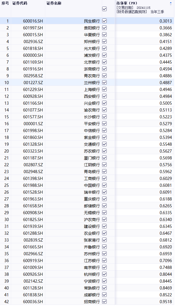 同花顺(300033)iFind显示,截至11月15日,民生银行、贵阳银行(601997)(601997.SH)、华夏银行的市净率(PB)均低于0.4。