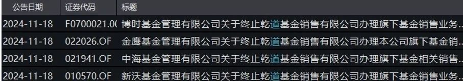 其中,新沃基金、金鹰基金两家公司与乾道基金正式解约的时间为11月18日,即相关公告发布当天。中海基金则表示,将于11月19日起终止与乾道基金在基金销售业务上的合作。