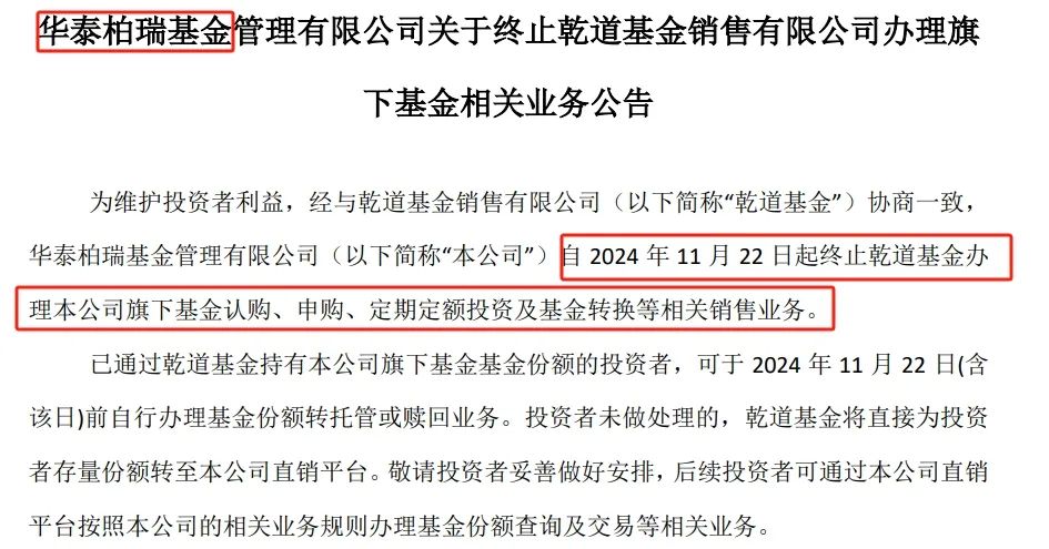 11月18日,华泰柏瑞基金公告称,为维护投资者利益,经与乾道基金协商一致,自2024年11月22日起终止乾道基金办理公司旗下基金认购、申购、定期定额投资及基金转换等相关销售业务。已通过乾道基金持有公司旗下基金份额的投资者,可于2024年11月22日(含该日)前自行办理基金份额转托管或赎回业务。