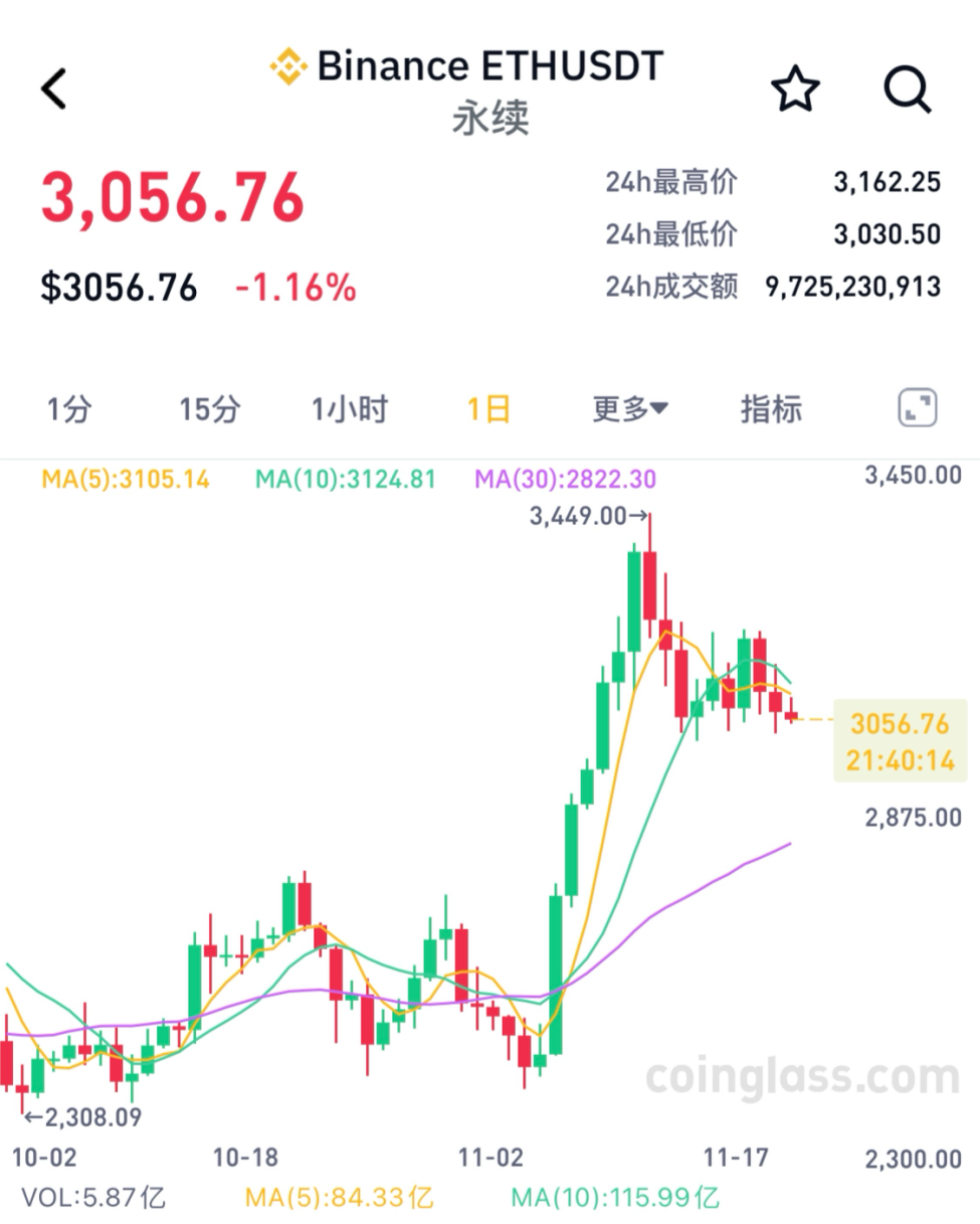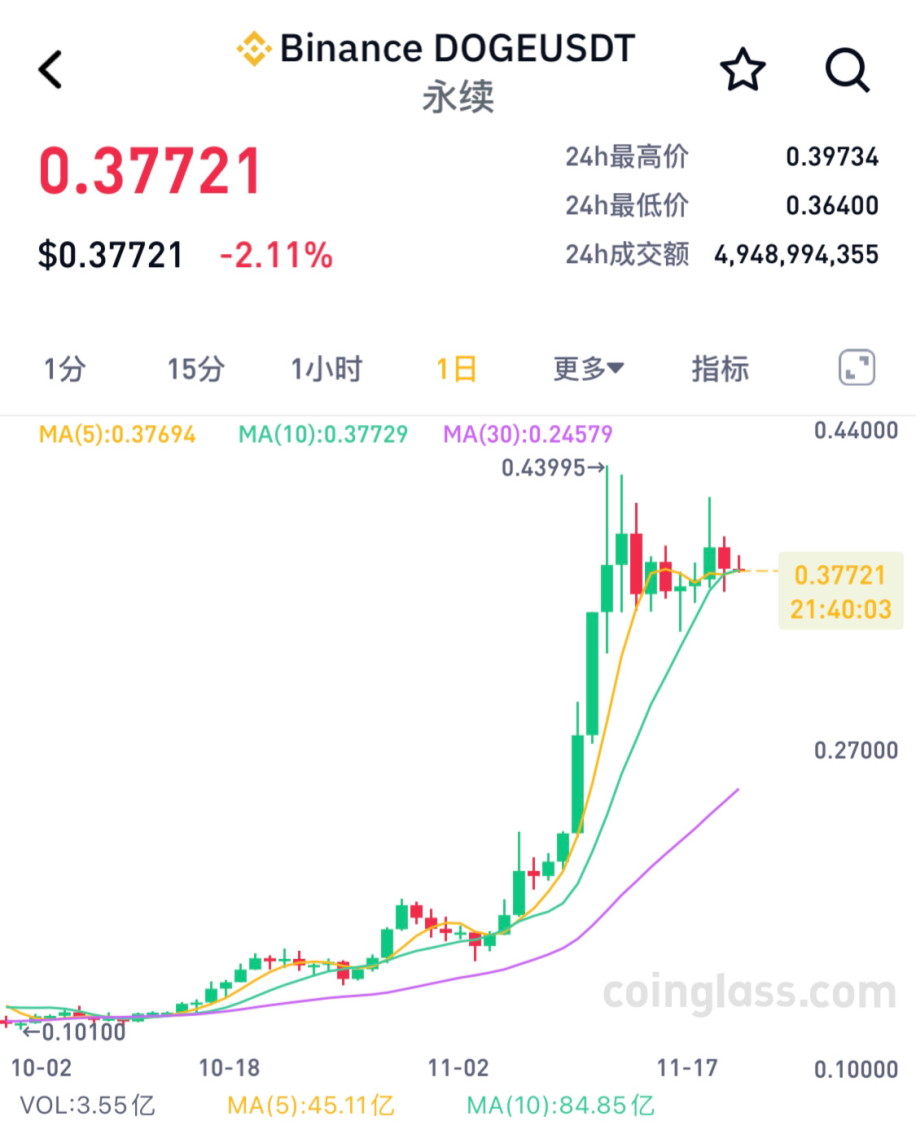 与比特币持续上涨不同的是,11月21日,多数加密货币出现下跌。截至发稿,以太坊(ETH)下跌1.16%,狗狗币(DOGE)下跌2.11%。