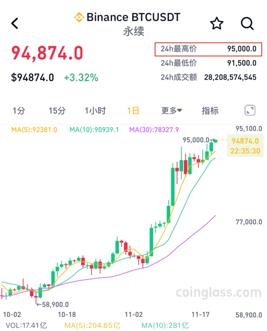 11月21日,比特币价格持续上涨,并一度站上95000美元/枚的历史高位。此后有所回落,截至发稿,价格为94874美元/枚,上涨3.32%。