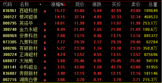 稀土板块午后逆市拉升,截至收盘,西磁科技涨近16%,银河磁体涨超14%,英洛华涨停,金力永磁(300748)涨超8%,正海磁材(300224)涨超4%,大地熊、中科磁业(301141)等涨超3%。