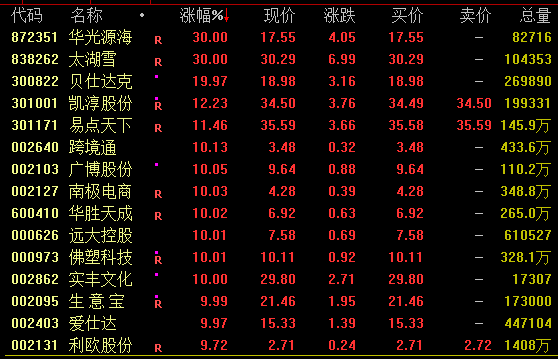 跨境电商概念盘中走势活跃,截至收盘,华光源海、太湖雪30%涨停,贝仕达克连续两日涨停,凯淳股份(301001)涨超12%,跨境通(002640)、南极电商(002127)、生意宝(002095)等均涨停。