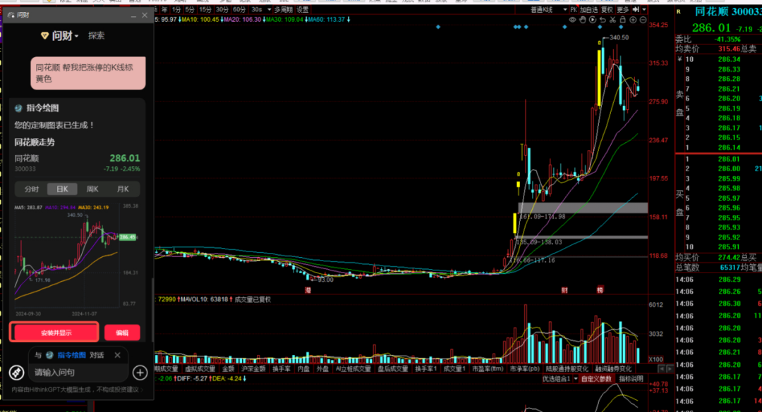 同花顺AI PC版可为不同类型的投资者提供全方位支持。技术面投资者可以通过智能画线识别支撑压力位,利用六脉神剑指标(包含MACD、KDJ、BBI等六大指标)进行多指标监控,还能标记”一阳穿三线"等买点信号。基本面投资者则可在K线图快速查看简版F10,了解股票的行业分类、大股东信息及关键财务指标。对于中长线投资者,系统能基于菲波那契数列生成常用均线组合,帮助把握市场趋势。短线投资者可以实时监控沪深A股涨跌分布,计算偏离值和换手率,并通过特定条件标记"冲"、"跑"等交易信号。考虑到不同用户的特殊需求,系统甚至可以根据指令为色盲用户调整K线颜色显示。通过这种自然语言交互方式,投资者能够获得高效且个性化的投资逻辑支持。