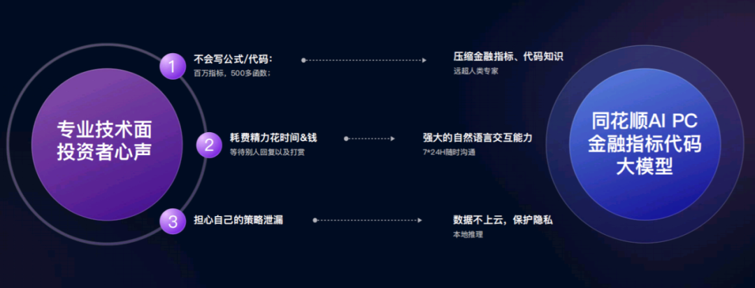 同花顺AI PC版的核心优势在于其独特的金融指标代码大模型—HiThinkGPT-Indicator-Instruct。该模型在同花顺自研Hithink GPT基模之上,继续经过3000万行的真实策略代码数据预训练和百万级基于专家标注的合成指令偏好对齐数据后训练,具备了精准、可靠的金融策略逻辑代码理解与解析能力。用户通过自然语言对话即可实现智能画线、指标设置、指令控制、交易信号展示、数据可视化等软件级功能。解决了投资者需花费大量时间学习指标代码语言,每次写指标都请人帮忙的烦恼,以及担心自己研究的投资逻辑被人知道的核心痛点。