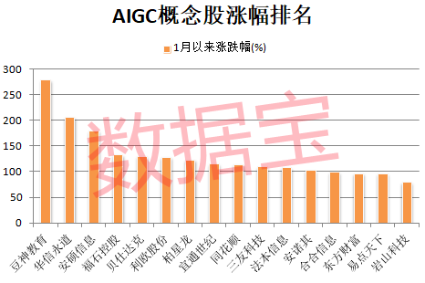 据证券时报·数据宝统计,截至12月9日,涉及AIGC的概念股接近200只,合计A股市值接近3万亿元。今年以来有12只概念股累计涨幅翻倍,包括豆神教育(300010)、华信永道、安硕信息(300380)、福石控股(300071)、贝仕达克(300822)等。豆神教育(300010)累计涨幅279.64%,高居榜首。该公司始终致力于持续深化人工智能(885728)生成内容(AIGC)技术在业务中的应用,已于10月30日正式发布全新超拟人AI智教产品。