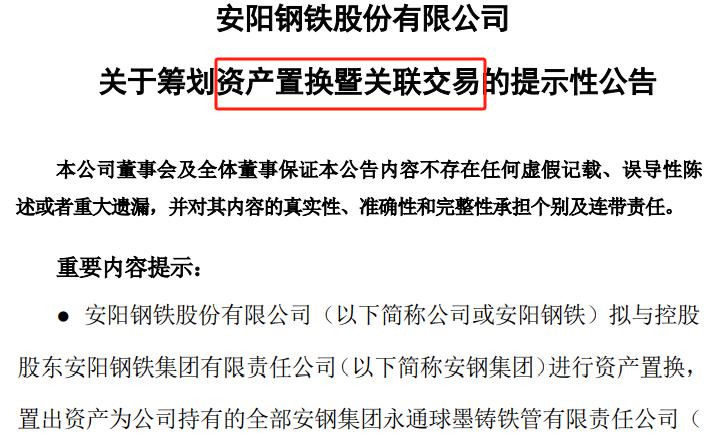 12月12日晚,安阳钢铁(600569)公告,拟与控股股东安钢集团进行资产置换,置出资产为公司持有的全部安钢集团永通球墨铸铁管有限责任公司(以下简称永通公司)股权及部分环保资产,置入资产为安钢集团持有的部分河南安钢集团舞阳矿业有限责任公司(以下简称舞阳矿业公司)股权。本次交易后,舞阳矿业公司成为安阳钢铁(600569)的控股子公司。