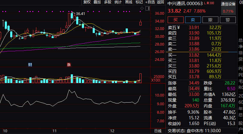 行业板块和赛道方面,通信设备(881129)板块大涨,大唐电信(600198)、瑞斯康达(603803)、卓翼科技(002369)等股票盘中涨停。板块龙头中兴通讯(HK0763)盘中亦一度触及涨停,截至发稿,中兴通讯(HK0763)单只股票成交额已超过100亿元,为上午A股市场个股成交额最高,中兴通讯(HK0763)最新总市值超过1500亿元。
