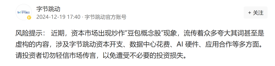 对于近期豆包概念股大涨的情况,字节跳动官方发文预警称,近期资本市场出现炒作“豆包概念股”现象,流传着众多夸大其词甚至是虚构的内容,涉及字节跳动资本开支、数据中心花费、AI硬件、应用合作等多方面。请投资者切勿轻信市场传言,以免遭受不必要的投资损失。