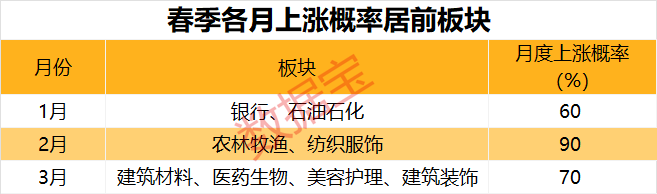 以申万31个行业过去10年的月度表现来看,春季3个月份中,消费(883434)板块整体表现较好。二月份,农林牧渔、纺织服饰两大行业上涨概率高达90%,且10年平均上涨幅度分别为3.99%和4%。3月份,建筑材料(881115)、医药生物、美容护理(881182)、建筑装饰(881116)的上涨概率较高,均达到70%,平均上涨幅度均超4%。