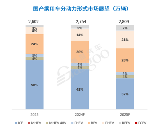 而新能源细分市场中,不同于以往纯电主导的特点,将呈现多种动力形式并存发展的新格局。目前,插混及增程产品凭借无续航焦虑、使用成本低、性价比高等特征,获得更多消费者的青睐。国内主流车企纷纷入场,布局插混和增程技术路线产品。盖世汽车研究院预测,2025年插混及增程将保持高速增长,成为新能源销量增长主动力,纯电市场销量增速将有所放缓。