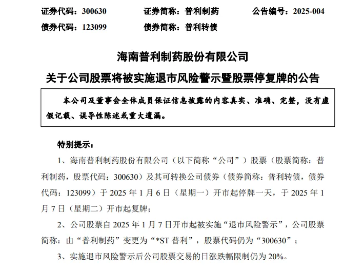 根据《创业板股票上市规则》相关规定,普利制药股票将于1月6日停牌一天,并自1月7日起被实施退市风险警示,可转债将于1月6日停牌和暂停转股一天。在被实施退市风险警示期间,普利制药需每5个交易日披露1次相关事项进展并就公司股票可能被实施重大违法强制退市进行特别风险提示。之后,普利制药收到行政处罚决定书后,公司股票及可转债将停牌等待最终的终止上市决定。退市风险早有预兆,30余次风险提示公告
