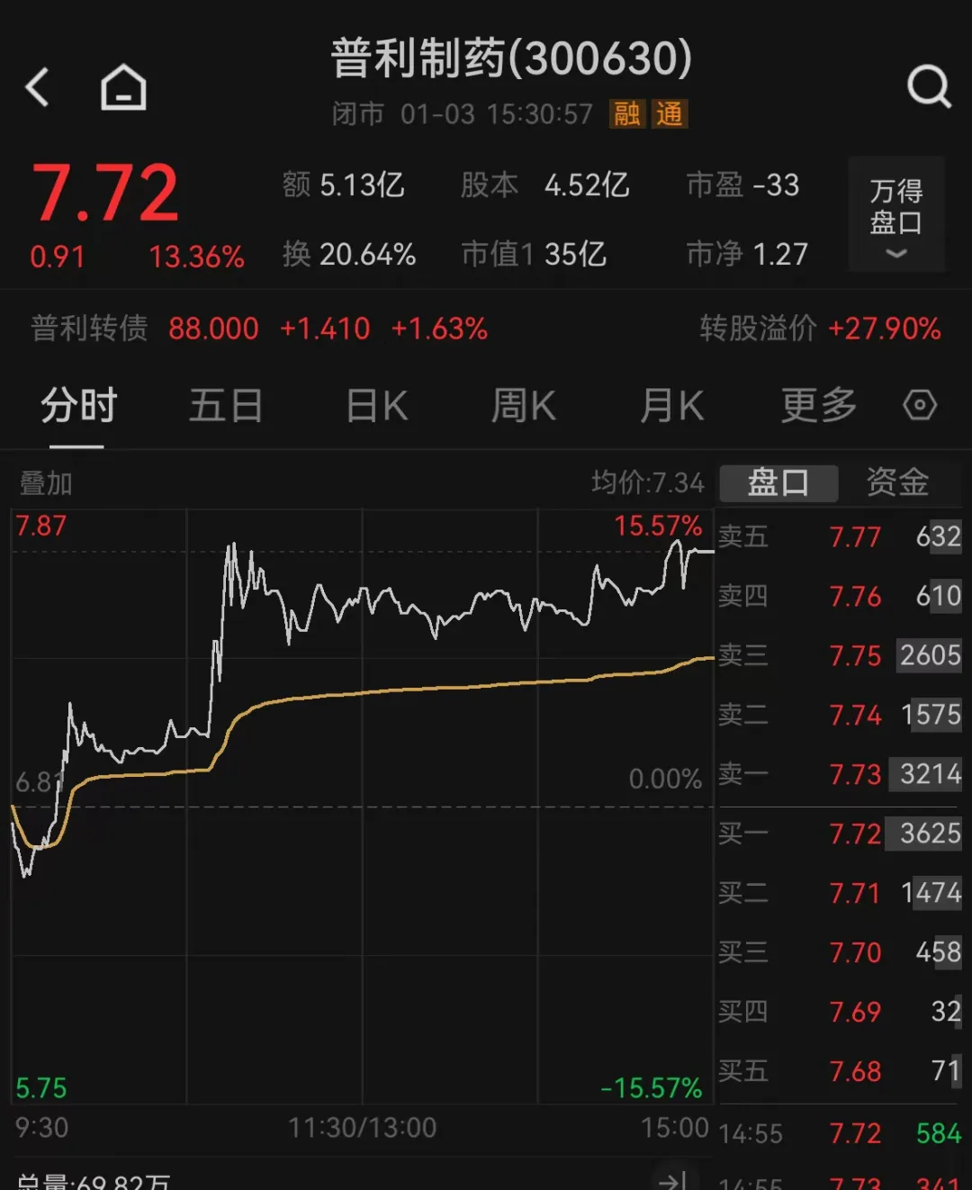 值得注意的是,本周五(1月3日)普利制药股价大涨13.36%,收盘报7.72元,目前总市值34.88亿元。
