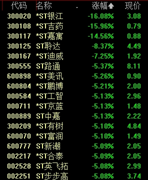 ST步步高(002251)、*ST美讯(600898)等20余股跌停,*ST吉药(300108)、*ST银江(300020)均跌超10%。