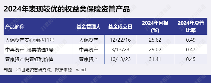 权益类保险资管产品有“人保资产安心通港11号”、“中再资产-股票精选1号”、“泰康资产悦泰红利价值”等。