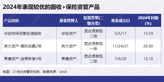 “固收+”保险资管产品则有“华安财保资管安源固收”、“英大资产-稳利创赢2号”、“泰康资产-益泰新享5号”等。