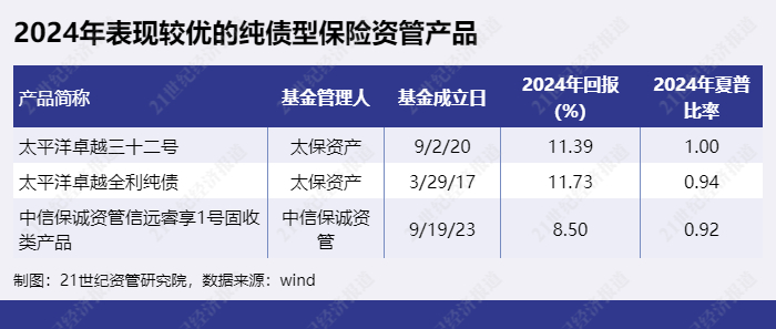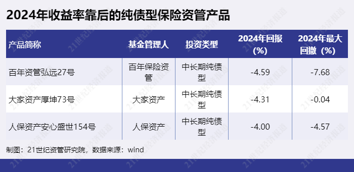 2024年收益率靠后的纯债型保险资管产品为“百年资管弘远27号”、“大家资产厚坤73号”、“人保资产安心盛世154号”等。