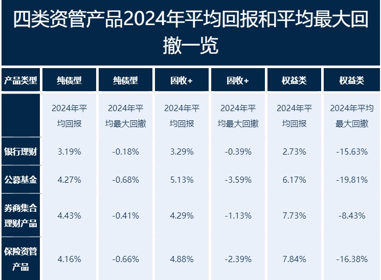 保险的权益、券商的纯债、基金的固收+表现最佳,理财是资管圈“稳健生”丨2024资管产品表现