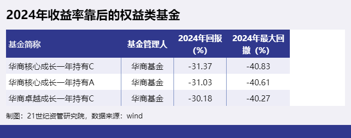 2024年收益率靠后的权益类基金为“华商核心成长一年持有C”、“华商核心成长一年持有A”、“华商卓越成长一年持有C”等。