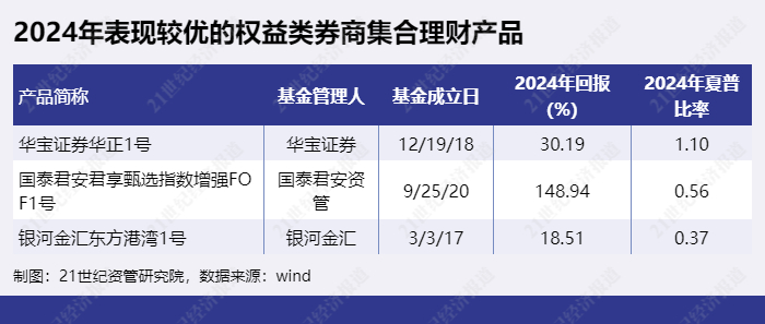 权益类券商集合理财产品则有“华宝证券华正1号”、“国泰君安君享甄选指数增强FOF1号”、“银河金汇东方港湾1号”等。