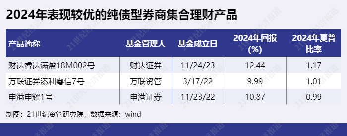 回报较高并且兼具性价比的纯债型券商集合理财产品有“财达睿达满盈18M002号”、“万联证券添利粤信7号”、“申港申耀1号”等。