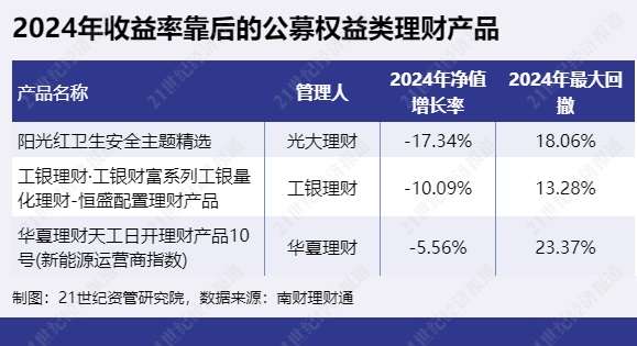 表现相对较差的权益类产品方面,2024年收益率靠后的公募权益类理财产品为“阳光红卫生安全主题精选”、“工银财富系列工银量化理财-恒盛配置理财产品”、“华夏理财天工日开理财产品10号(新能源运营商指数)”等。