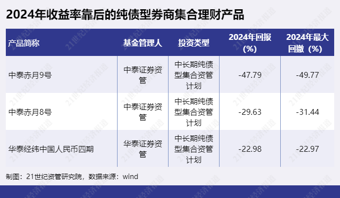 2024年收益率靠后的纯债型券商集合理财产品为“中泰赤月9号”、“中泰赤月8号”、“华泰经纬中国人民币四期”等。