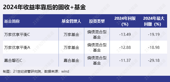 表现较差的“固收+”产品中,2024年收益率靠后的“固收+”基金为“万家优享平衡C”、“万家优享平衡A”、“嘉合磐石C”等。