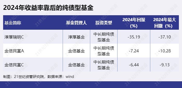 表现相对较差的纯债型产品中,2024年收益率靠后的纯债型基金包括“淳厚瑞明C”、“金信民富A”、“金信民富C”等。