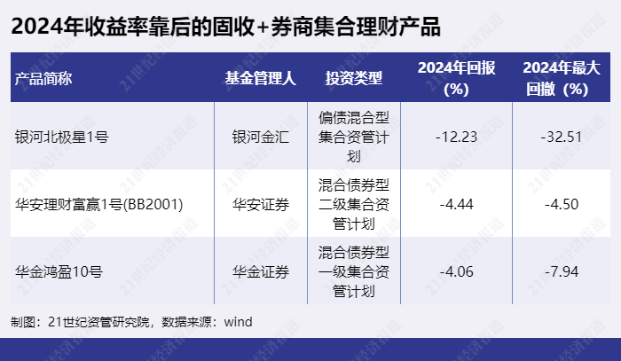 2024年收益率靠后的“固收+”券商集合理财产品包括“银河北极星1号”、“华安理财富赢1号(BB2001)”、“华金鸿盈10号”等。